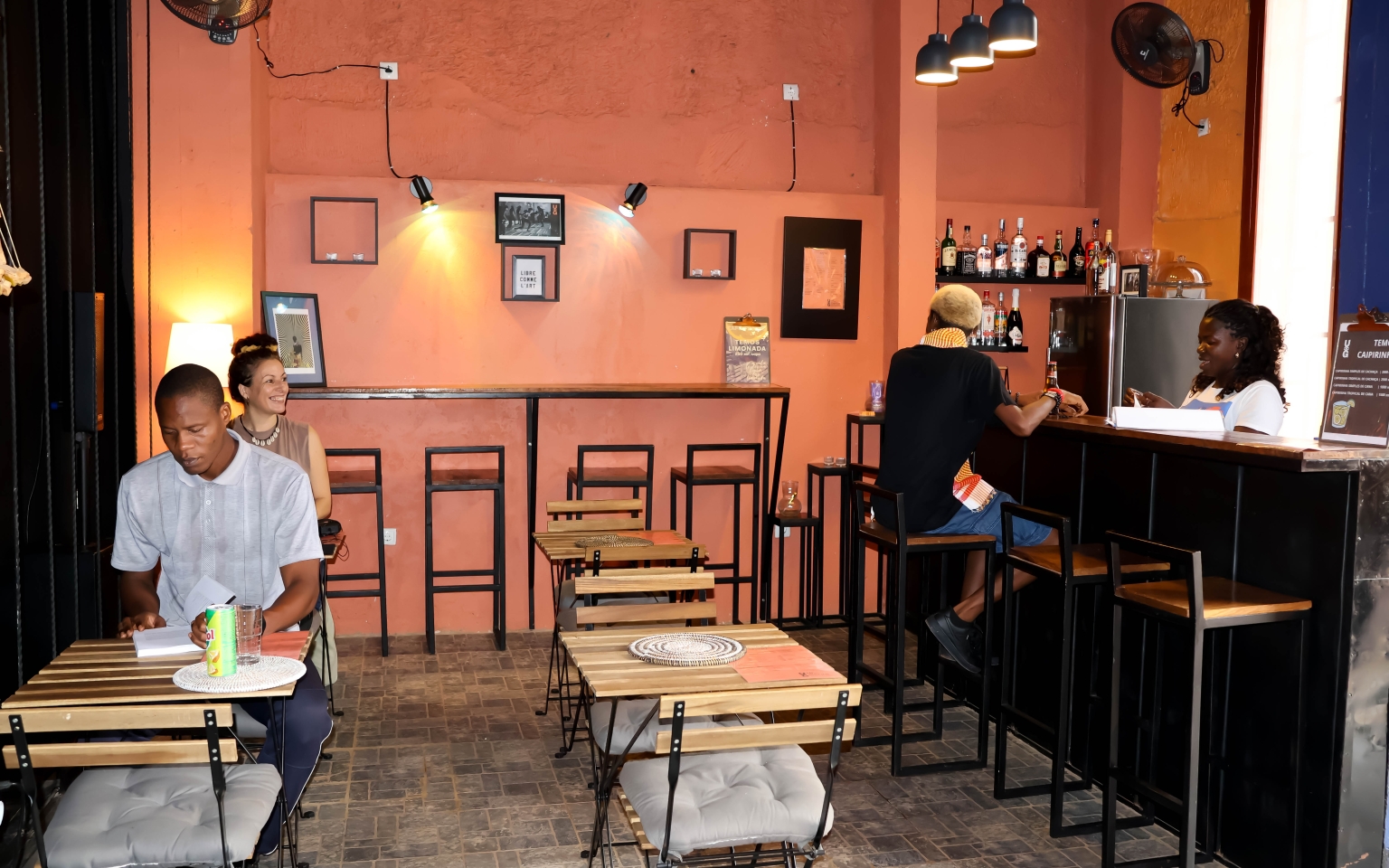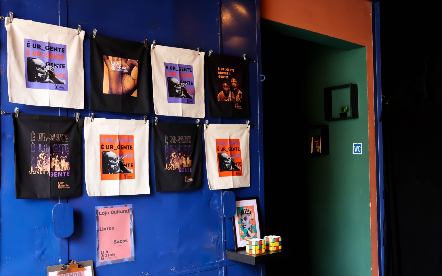 Livros com ênfase na literatura guineense, acessórios feitos com pano wax, peças de artesanato, produtos naturais, além do nosso merchandising exclusivo